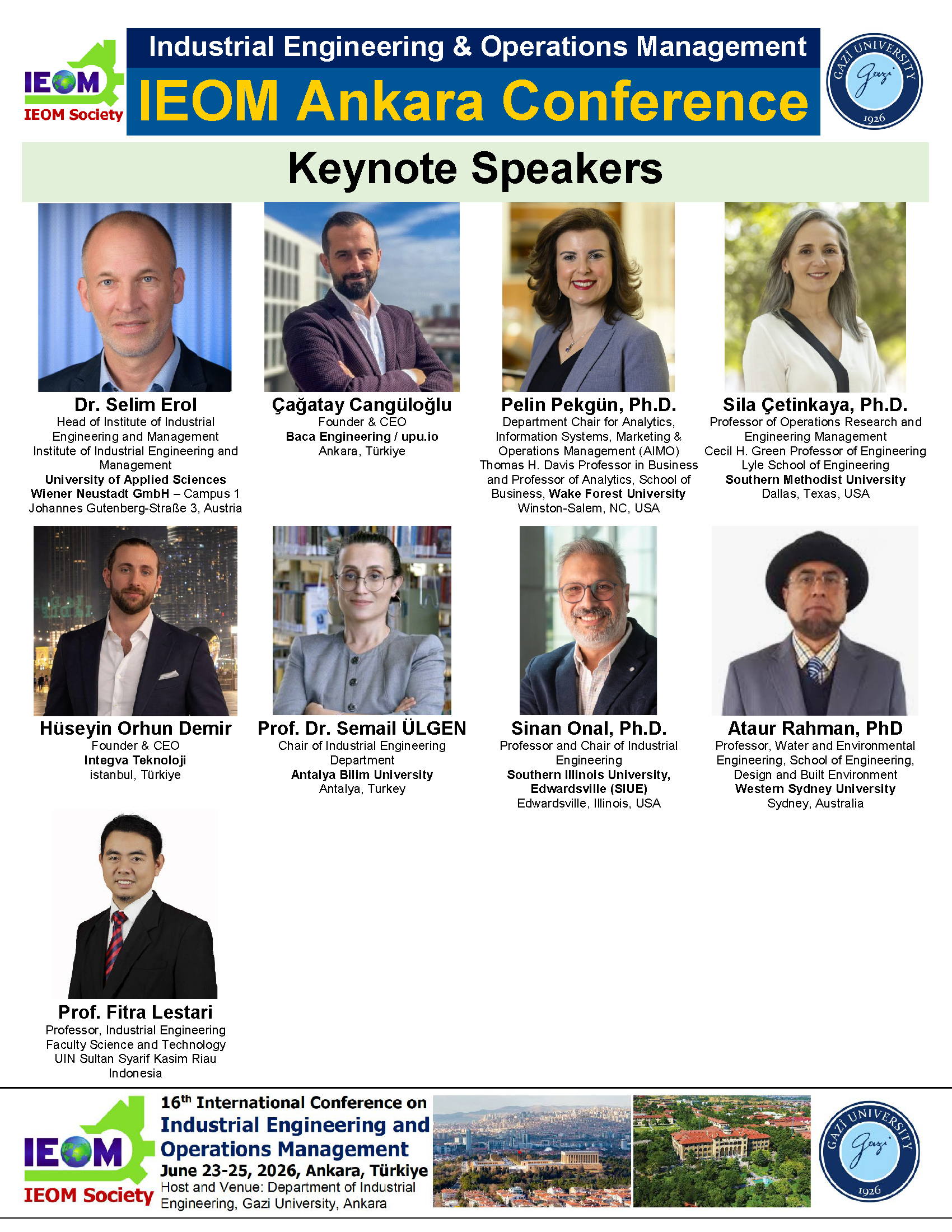 IEOM Society International and Department of Industrial Engineering, Gazi University, Ankara are organizing the 16th International Conference on Industrial Engineering and Operations Management in Ankara, Türkiye. The conference will provide an opportunity for academics, researchers, and practitioners to exchange ideas and explore recent developments in the field of Industrial Engineering and Operations Management. The conference is also expected to foster networking, collaboration, and joint effort among the conference participants to advance the theory and practice as well as to identify major trends in Industrial Engineering and Operations Management.