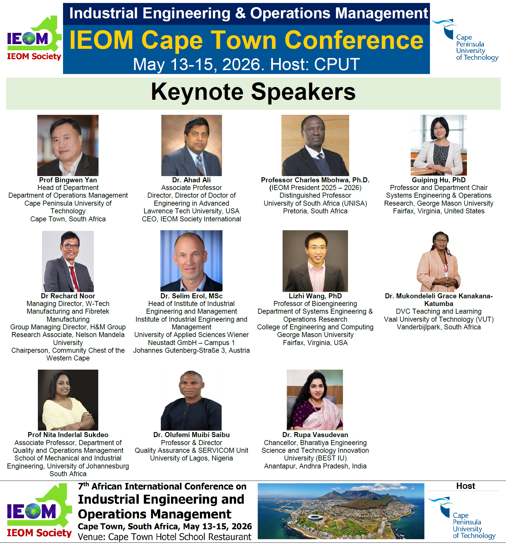IEOM Society International is organizing the 7th African International Conference on Industrial Engineering and Operations Management, Cape Town, South Africa, May 13-15, 2026. The host is Cape Peninsula University of Technology.