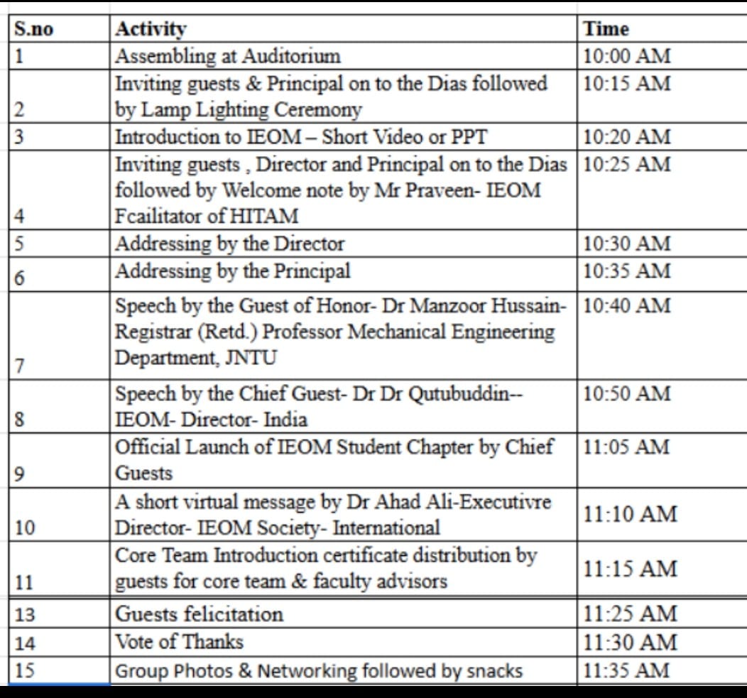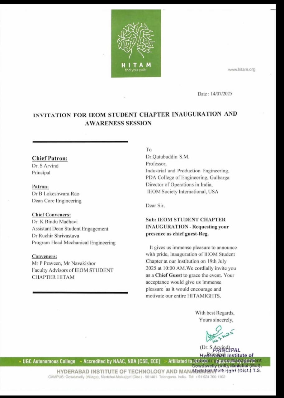 Chapter Name: – IEOM STUDENT CHAPTER HITAMÂ (Hyderabad Institute of Technology and Management)